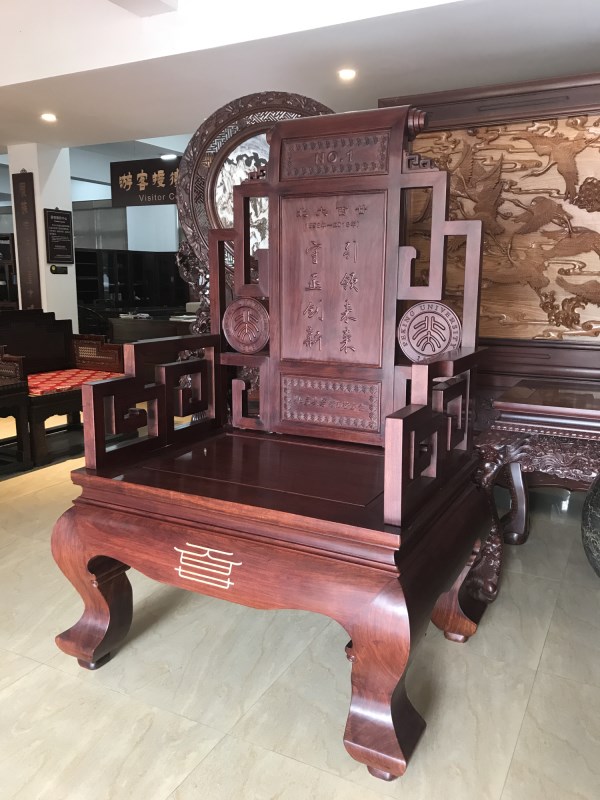 椅子采用刺猬紫檀制作而成,造型磅礴大氣,碩大威武,融入了“北大”校訓(xùn)及辦學(xué)理念,既有勵志意義,又具有新時代的創(chuàng)新理念,真是名副其實的“第一把交椅”。